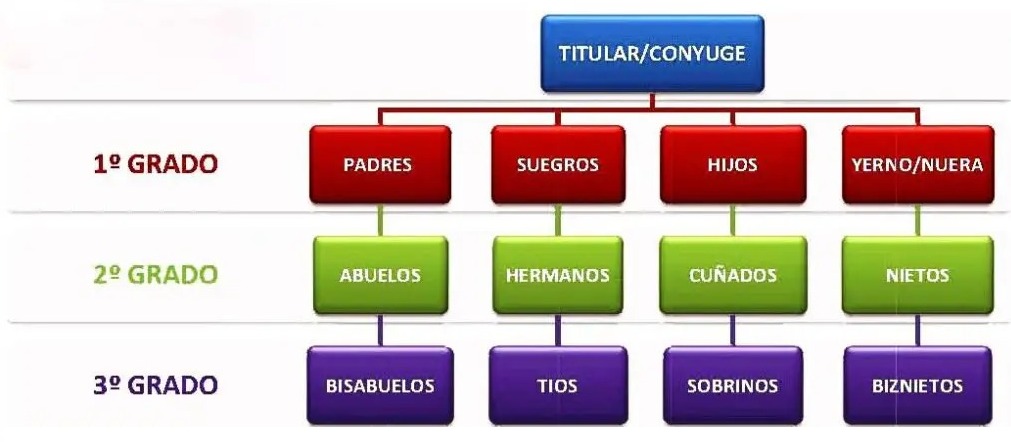 - Familiares hasta tercer grado de consanguinidad o afinidad (madre, padre; suegra, suegro; nuera, yerno; tía, tío; sobrina, sobrino; nieta, nieto; y sus equivalentes por afinidad, como tías políticas y tíos políticos, sobrinas políticas y sobrinos políticos).